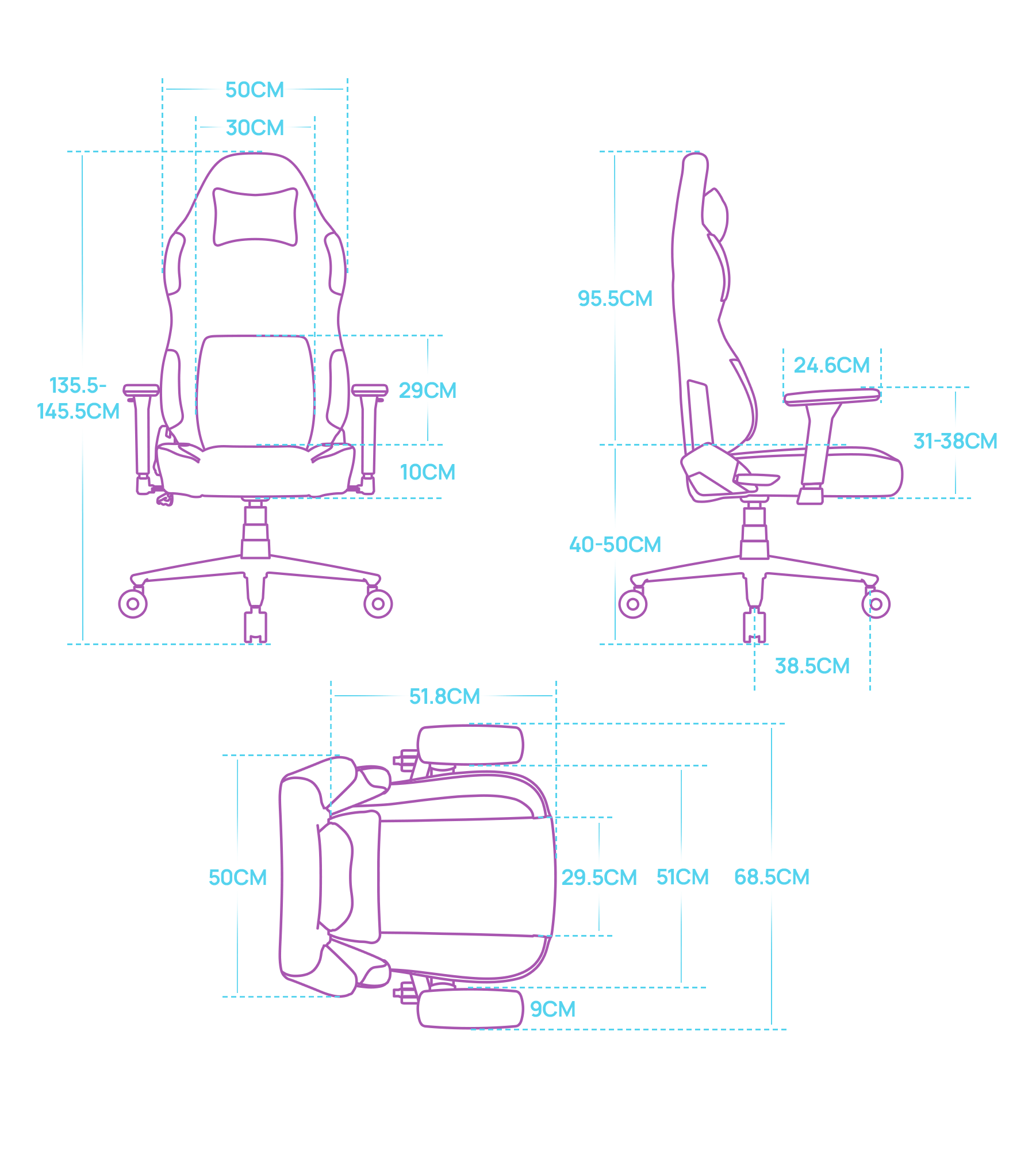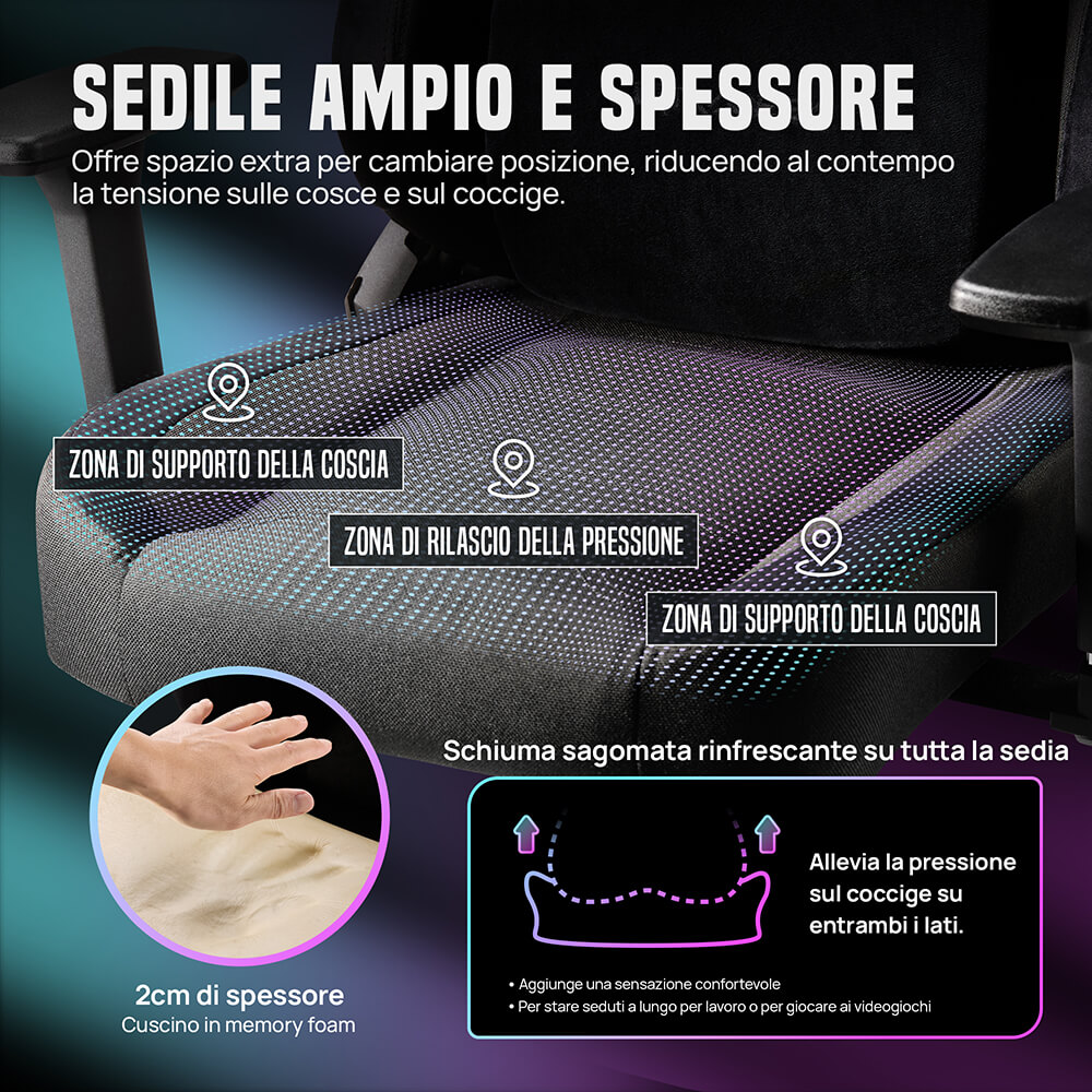 La struttura esterna di questa sedia da computer si basa sulle più recenti ricerche sulla corretta postura durante il lavoro alla scrivania. L’intera seduta ha una forma ergonomica. È stata rinforzata e allargata per offrire il massimo comfort e consentire all’utente una maggiore libertà di movimento rispetto alle anguste sedie da gaming presenti sul mercato. La forma della seduta riduce efficacemente lo sforzo su cosce e coccige. Supporti per le cosce appositamente sagomati sono fissati su entrambi i lati. All’interno della seduta è presente un cuscino in memory foam resistente.