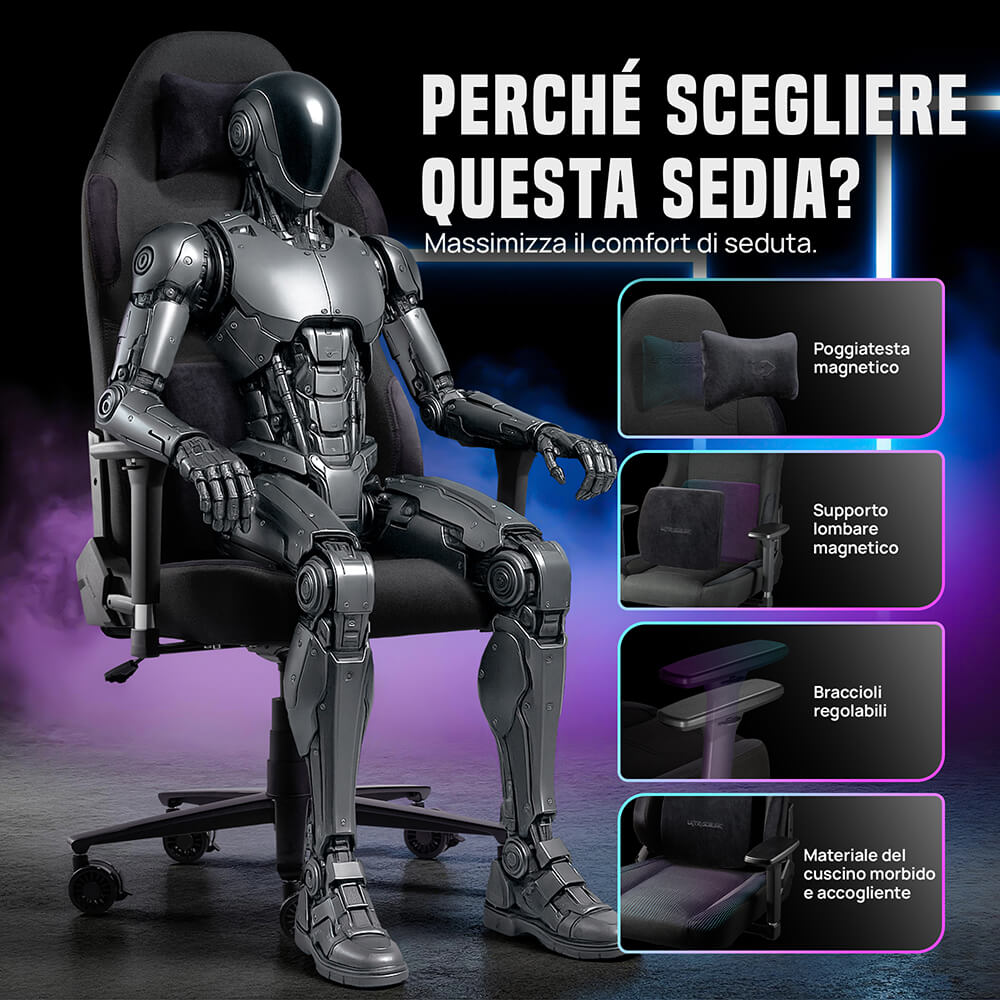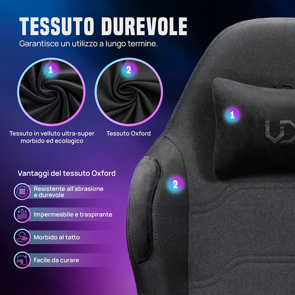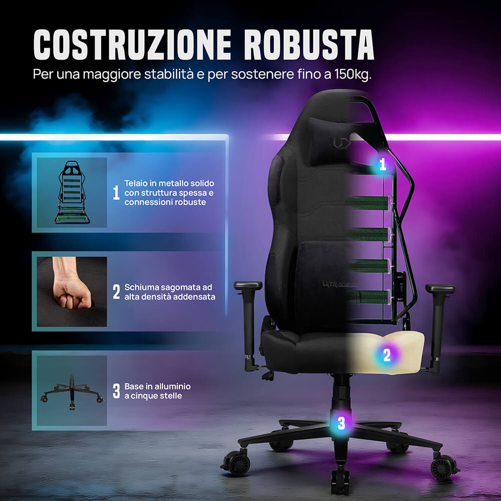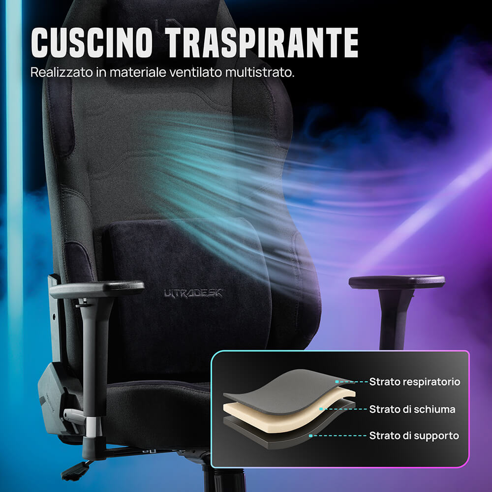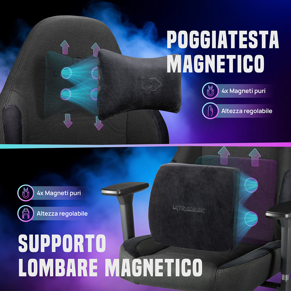 Questo mobile è dotato di un poggiatesta ergonomico e di uno speciale supporto lombare. Entrambi gli elementi sono fissati allo schienale della sedia tramite potenti magneti, garantendo un montaggio rapido e sicuro. Sono inoltre regolabili in altezza, consentendo un adattamento ottimale all’altezza e alla corporatura dell’utente. Il poggiatesta favorisce una postura corretta, riduce la tensione cervicale e previene i dolori. Entrambi i supporti sono rifiniti nel classico nero, in perfetta armonia con il design della sedia da gaming ULTRADESK OVERLORD.