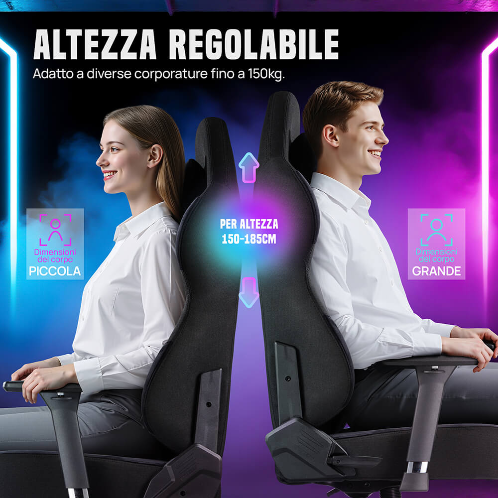 Questo prodotto è progettato per persone di altezza compresa tra 150 e 185 cm e di peso fino a 150 kg. La corretta regolazione dell’altezza della sedia è fondamentale per l’ergonomia e la salute della colonna vertebrale. Favorisce una postura neutra e corretta, riducendo al minimo il rischio di dolore e problemi di salute. L’altezza corretta garantisce una distribuzione uniforme del peso e mantiene la curvatura naturale della colonna vertebrale. Questo previene la tensione muscolare nella zona lombare, toracica e cervicale che può derivare dalla compensazione di una postura scorretta.