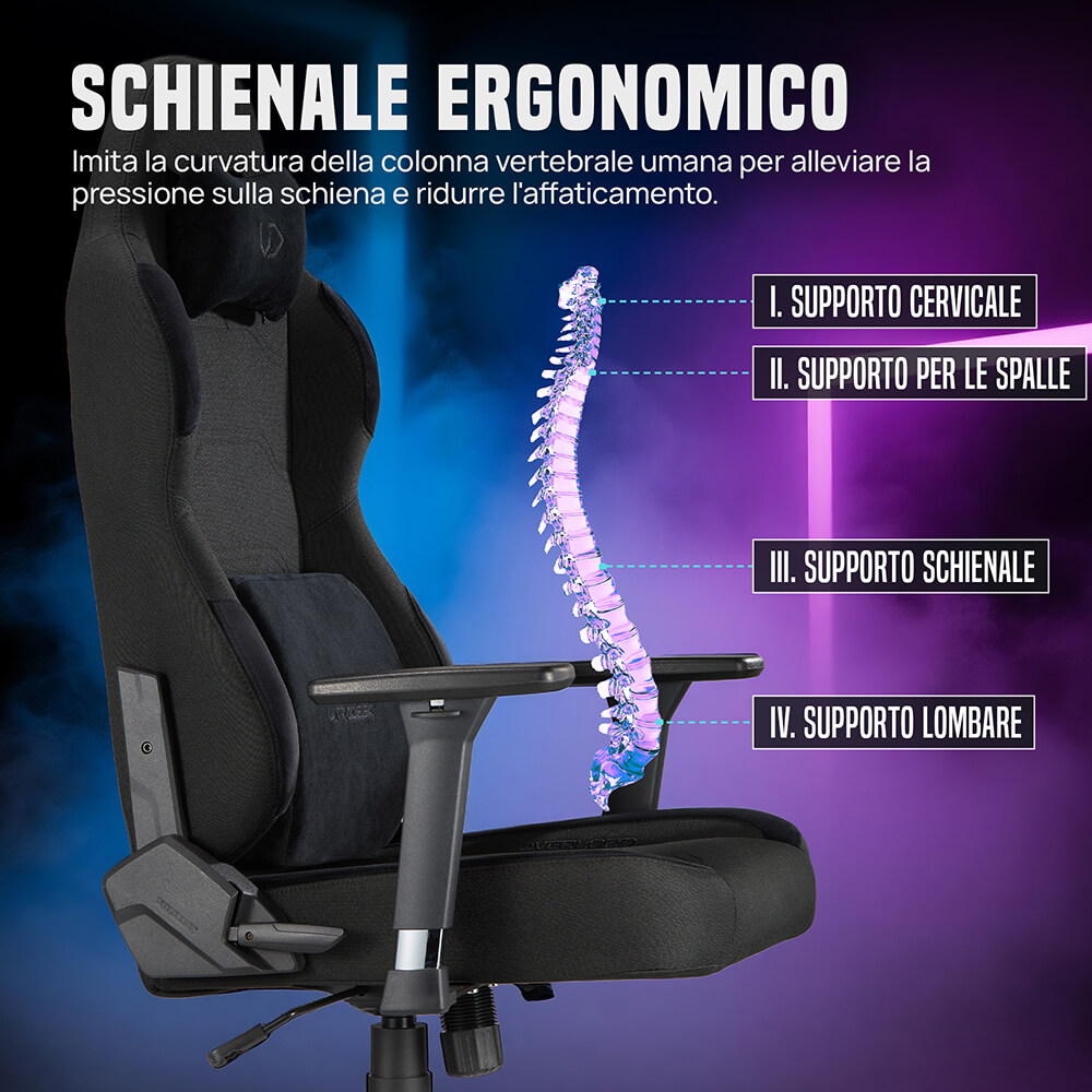 Lo schienale è progettato per imitare la curvatura naturale della colonna vertebrale umana. Il suo scopo principale è alleviare la tensione alla schiena e ridurre l’affaticamento durante una seduta prolungata. Il supporto per il collo migliora il comfort e aiuta ad alleviare la tensione cervicale. Il supporto per le spalle stabilizza la parte superiore del corpo. Il nostro schienale ergonomico ha un effetto positivo sul comfort dell’intera colonna toracica. Il supporto lombare è fondamentale per mantenere la curvatura naturale e sostenere la parte bassa della schiena. Salute e comfort vanno di pari passo!