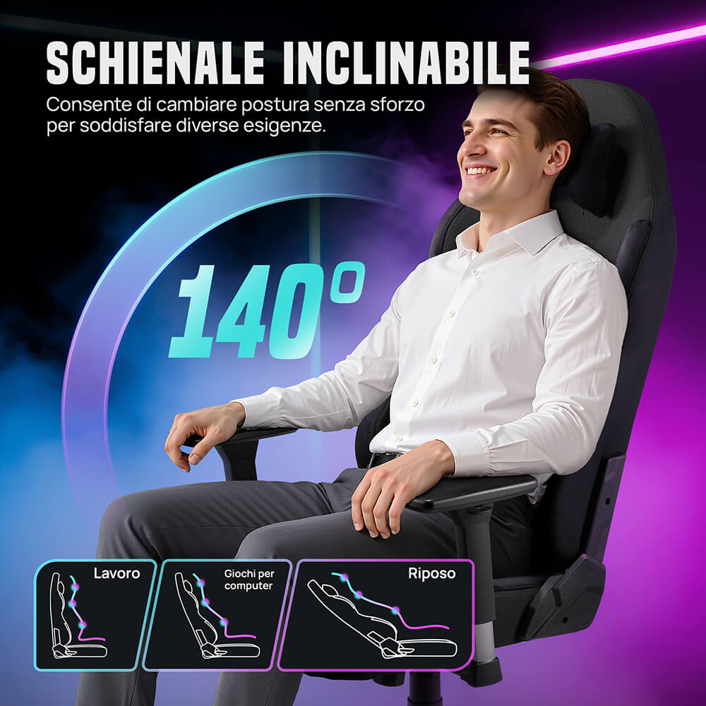 Lo schienale regolabile consente di adattare facilmente la postura alle proprie esigenze. Grazie all’ampia gamma di regolazioni, questa sedia è versatile e ideale per una varietà di situazioni. Che tu stia lavorando, giocando ai videogiochi o semplicemente rilassandoti, con questo schienale troverai sempre la posizione perfetta. Lo schienale della sedia ULTRADESK OVERLORD può essere reclinato fino a 140 gradi. La regolazione avviene comodamente tramite una leva sul lato destro.