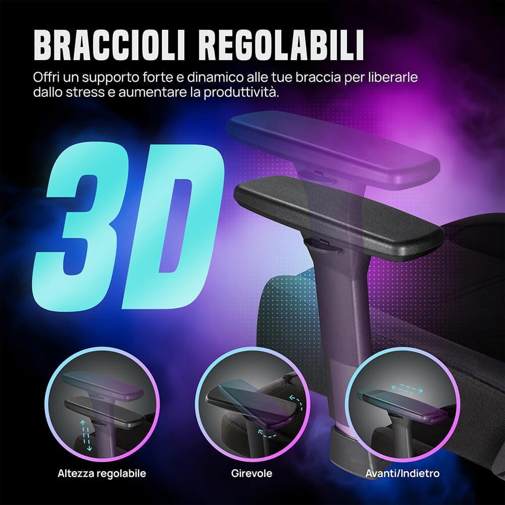I braccioli 3D offrono tre opzioni di regolazione e servono principalmente ad aumentare la produttività dell’utente attraverso una postura ergonomica. La regolazione 3D consente un adattamento preciso della posizione del bracciolo alla postura dell’utente e all’altezza della scrivania, riducendo significativamente lo sforzo sui muscoli delle spalle e del collo. L’altezza può essere regolata facendo scorrere il bracciolo verticalmente verso l’alto o verso il basso. La funzione di rotazione consente il movimento orizzontale del cuscinetto del bracciolo. Un terzo meccanismo di regolazione consente al cuscinetto di muoversi avanti e indietro per adattare il supporto alla lunghezza dell’avambraccio e alla distanza dal bordo della scrivania. Grazie a queste tre opzioni di regolazione (su/giù, rotazione, avanti/indietro), i braccioli 3D migliorano significativamente l’ergonomia e il comfort durante periodi di seduta prolungati.