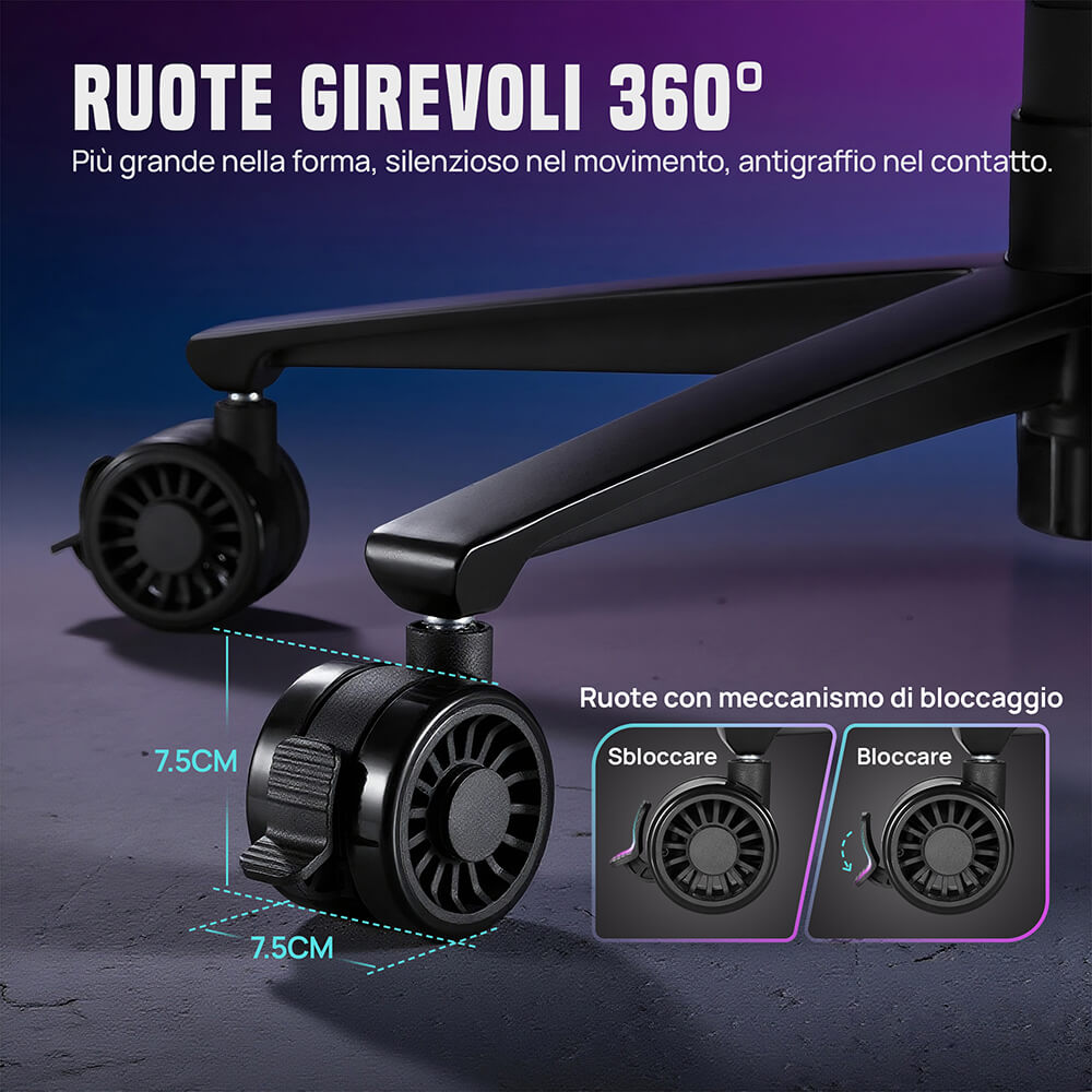 Il set include ruote girevoli a 360° funzionali con un ampio diametro di 7,5 cm, che garantiscono un’eccellente manovrabilità su una varietà di superfici e un funzionamento eccezionalmente silenzioso. Sono realizzate in un materiale durevole e resistente alla rottura anche sotto carichi pesanti. Per fermare la sedia in una posizione specifica, è possibile utilizzare i comodi meccanismi di bloccaggio, che possono essere facilmente sbloccati quando necessario. Un altro vantaggio di queste ruote è che non graffiano i pavimenti delicati.