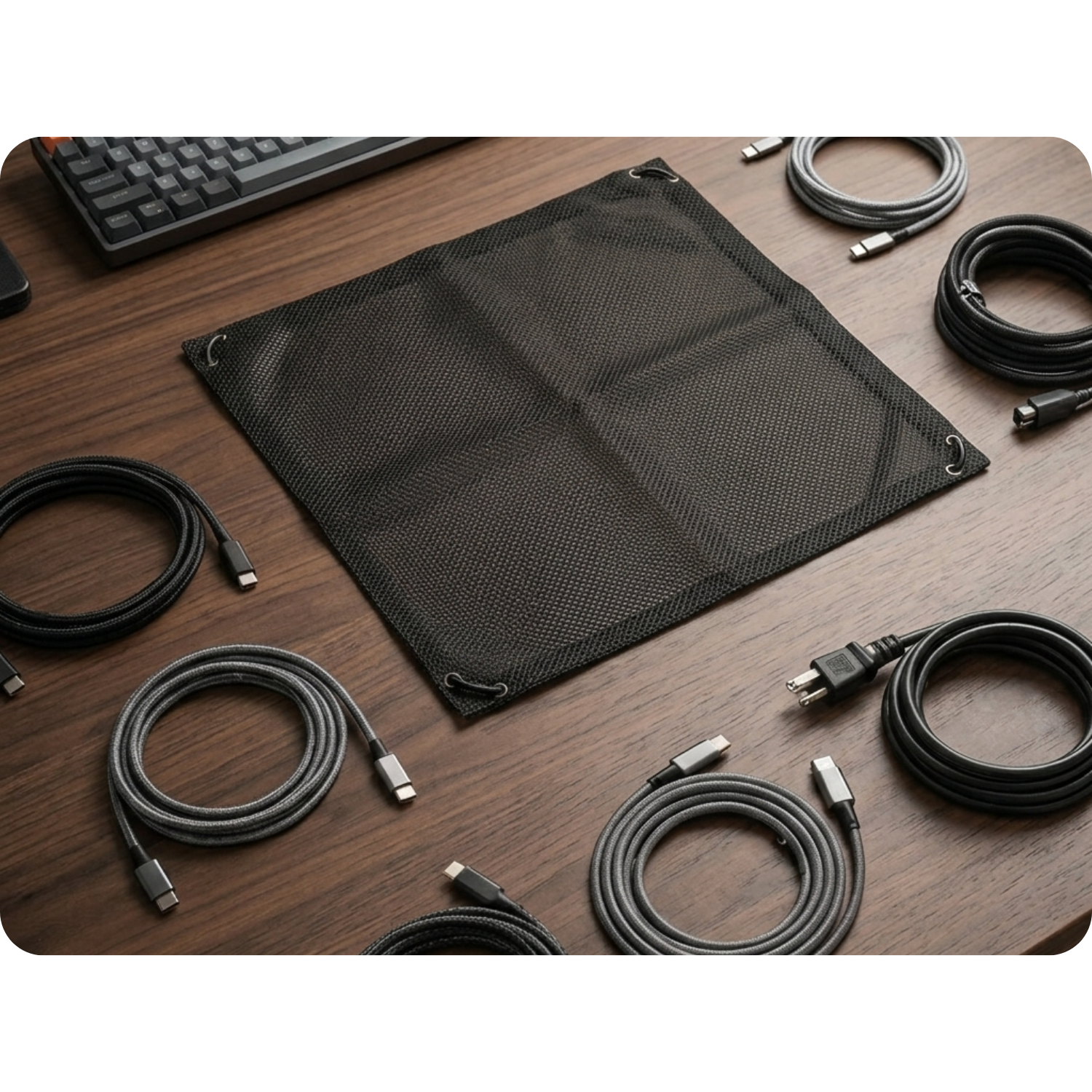 La rete portacavi flessibile da montare sotto la scrivania è una soluzione pratica per mantenere ordine nello spazio di lavoro. Grazie alle dimensioni di 45 × 45 cm, può contenere facilmente multiprese, caricabatterie e cavi, eliminando il disordine sotto il piano della scrivania.