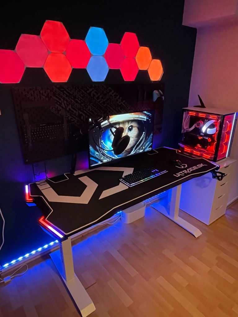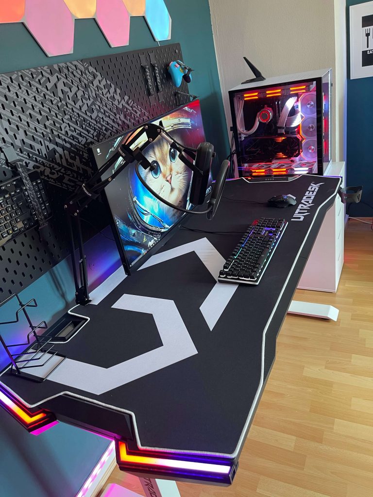 L’ultima versione estesa della nostra illuminazione LED RGB PRISMATIC proprietaria. Gli elementi luminosi sono installati in lunghi pannelli ai lati del desktop e in quattro strisce luminose situate all’interno del bordo posteriore. Alimentato tramite porta USB. Nessun modello di scrivania da gioco ha mai offerto un tale effetto di retroilluminazione. Devi vederlo con i tuoi occhi.